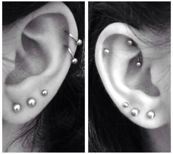 1. I have 10 piercings (and would like more 🙂 ), all on my ears: three on each lobe, double helix piercing on the left, single helix and rook piercings on the right.